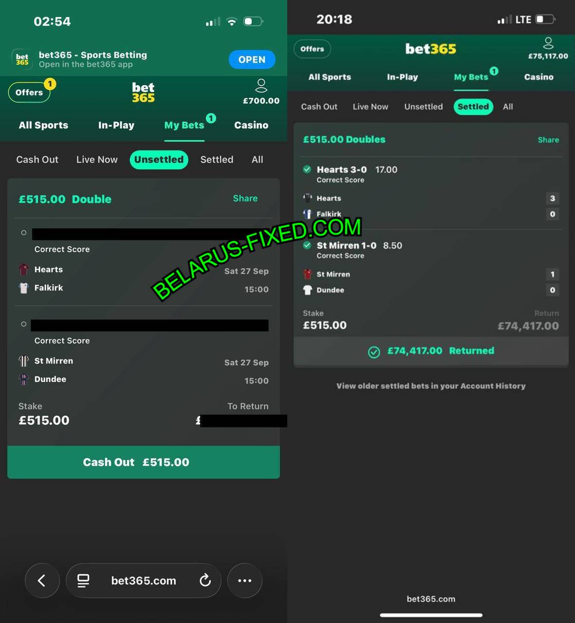 | Hearts vs Falkirk | 3:0 (CS) | 11.00 | FT: 3:0 WIN |