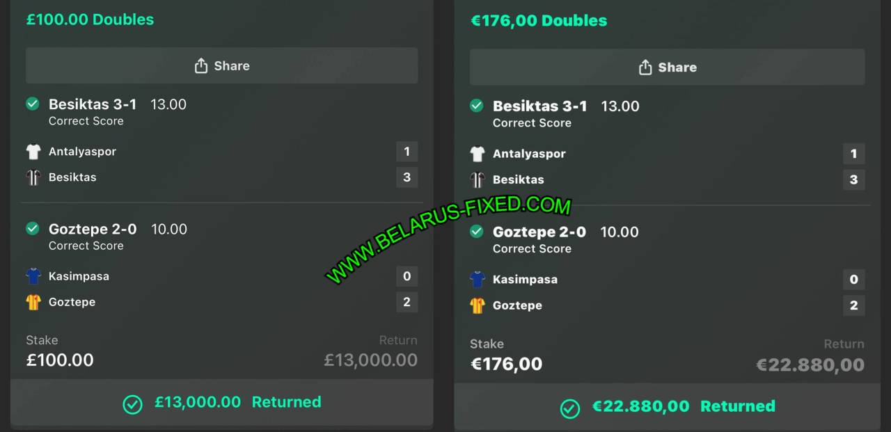 | Antalyaspor vs Besiktas | 1:3 (CS) | 13.00 | FT: 1:3 WIN |